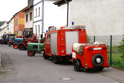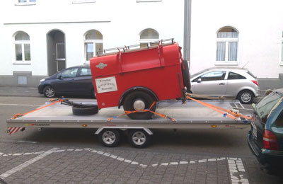 Da wie gesagt, dieser Sonderlöschanhänger zu schade für die Abstellkammer ist und für die Villa Borg mit seinen zwei Löschmitteln einen idealen rollbaren Feuerlöscher darstellen würde, ist ein längerfristiger Aufenthalt des PLA100/S100 in der Villa Borg im Gespräch. 20130820 - Neu bei der FOFW: Kombinierter Pulverlösch- und Schaumlöschanhänger TOTAL WALTHER PLA100/S100 Da er technisch interessant ist und man "rein zufällig" fast in der Nähe weilte, wurde am 18. August spontan ein Pulverlösch-/Schaumlöschanhänger in Passau ersteigert - der Dank der Flexibilität der Feuerwehr Passau nach nur 150 km Anreise bereits am folgenden Tag mit unserem LF8 abgeholt werden konnte. Die Duchsicht vor Ort war erfreulich: Der Löschanhänger präsentierte sich in gutem Zustand und endlich einmal brauchte keine Beleuchtungsanlage Zuwendung (oder die Magnetleuchten...), auch die technische Dokumentation samt Betriebserlaubnis lag vor! Trotz seiner Winzigkeit von nur wenig mehr als 2 Metern Länge ist der Zwerg ein Schwergewicht: Pulver- und Schaumlöschanlage samt zwei Stickstoff-Flaschen ergeben gefüllt ein Gesamtgewicht von 750 kg. Trotz der kurzen Bauweise liegt der Anhänger gut auf der Straße, so daß die Überführung von guten 700 km ohne besondere Vorkommnisse verlief. 20130814 - Abschied vom 1961er DDR-TSA Am gestrigen Abend verließ der alte Görlitzer TSA die FOFW in Richtung Ibbenbüren. But einem weinenden, aber auch einem lachenden Auge: Dort soll er wieder als Feuerwehr-Oldtimer eingesetzt werden, was uns sehr freut! Zeit für einen kleinen Rückblick: Seit der Abholung auf eigener Achse im Bergischen Land im Mai war er in gut einem Vierteljahr sogar auf vier Oldtimertreffen dabei - alles auf eigener Achse! - und war damit bislang der absolute Spitzenreiter unter den Feuerwehranhängern der FOFW! Was uns neben schönen Erinnerungen und vielen Fotos von ihm bleibt: Die Jöhstadt TS8/8 Tragkraftspritze, die nun im 1982er DDR-TSA ihr neues Zuhause finden wird. 20130707 - Oldtimertreffen in Langerwehe Auf dem Rückweg von Merkstein war gerade noch genug Zeit, um am frühen Nachmittag noch dem Oldtimertreffen der Oldtimerfreunde Langerwehe beim Stadtfest in Langerwehe vorbeizuschauen, wo endlich ein lang ersehntes Wiedersehen mit einem Bulli-Freund erfolgen sollte. 20130707 - Feuerwehr-Fahrzeugschau anläßlich des Euregionalen Knappentages am Bergbaudenkmal Grube Adolf Samstag und Sonntag folgte die FOFW einer Einladung zur Feuerwehr-Oldtimerschau beim Bergbaudenkmal Grube Adolf in Herzogenrath-Merkstein. Samstag konnte neben dem LF8 noch einmal der 1961er DDR-TSA gezeigt werden, sogar die Jöhstadt/Barkas TS8/8 durfte kurz, aber lautstark und geruchsintensiv auf sich aufmerksam machen. Und am Sonntag war der "Eppelflori" ausnahmsweise mal wieder solo unterwegs, dafür traf er auf nette Feuerwehr-Oldtimer-Gesellschaft in Form eines Magirus Mercur von EuroBOS e.V. und eines 1928er Opel mit Aufbau und Frontpumpe von August Hoenig (Köln-Nippes) der Freiwilligen Feuerwehr Merkstein. Letzterer erwies sich als störrisch und verweigerte trotz intensiver Zuwendung von unserer Seite (und 12 V Starthilfe ...) vor Ort hartnäckig jeglichen Zündfunken an den Kerzen, so daß er leider auch die Heimreise an der Stange zurücklegen mußte. Immerhin konnten Verteilerkappe oder -Finger als Übeltäter diagnostiziert werden. Ausnahmsweise fanden sich im Ersatzteilfundus nicht zufällig genau die passenden Ersatzteile ... 20130625 - Nutzfahrzeug-Oldtimertreffen beim Bergbaudenkmal Grube Adolf in Herzogenrath-Merkstein Wieder einmal war die Zeit viel zu knapp! So reichte es nur zu einem kurzen samstäglichen Abstecher mit LF8 und TSA zum Nutzfahrzeug-Oldtimertreffen beim Bergbaudenkmal Grube Adolf in Herzogenrath-Merkstein - und schon gegen Mittag mußten wir wieder gen Saarland aufbrechen. Trotzdem bleiben einige unvergeßliche Eindrücke wie die ausführliche Führung durch das Maschinenhaus der Grube Adolf und die Anlaß- und Lauf-Demonstrationen des MAN-U-Boot-Motors. 20130616 - Jetzt bei eBay: unser 1961er Tragkraftspritzenanhänger des Feuerlöschgerätewerks Görlitz samt Tragkraftspritze des Feuerlöschgerätewerks Jöhstadt sowie Saug- und Druckschläuchen 20130616 - Oldtimertreffen "Classic Cars And Caravans 2013" in Niederkassel Eigentlich sollte es nur ein kurzer Abstecher auf dem zweiten Weg zum Oldtimertreffen in Sinzig-Franken sein, der Besuch des Niederkasselers Oldtimertreffens. Aber obwohl zeitig in Niederkassel angekommen, waren wir froh, das LF8-TSA-Gespann irgendwo inmitten der Menschenmassen parken zu können. An ein Durchkommen und Weiterfahren nach Sinzig war nicht vor dem späten Nachmittag zu denken! Aber auch hier wurde die Zeit nicht lang: Kaum war die Heckklappe des alten Görlitzer TSA geöffnet und die Jöhstadt TS8/8 ans Tageslicht gezerrt, konnte lang und ausdauernd mit aktiven und ehemaligen Feuerwehr-Angehörigen und -Interessierten gefachsimpelt werden. Schade, daß sich auch hier wenig Feuerwehrfahrzeuge eingefunden hatten. Noch mehr schade, daß mit dem Gespann ein Durchkommen zu ihnen unmöglich war. So führte ein Fußmarsch zum Habbelrather Magirus Rundhauber-TLF und zu einem ziemlich patinierten, aber erhaltenswerten Opel Blitz-LF8 in ausgefallener, aber historisch verbürgter Farbgebung. 20130615 - 9. Oldtimertreffen für Traktoren und Feuerwehren in Sinzig-Franken Einen freundlichen und persönlichen Empfang freute unser LF8 und den mitgereisten alten Görlitzer TSA beim von der Feuerwehr Franken ausgerichteten 9. Oldtimertreffen in Sinzig-Franken. Der Schwerpunkt der Schau lag eindeutig auf den Landmaschinen - nur wenige Zweiräder und Oldtimer-PKW fanden sich im Frankener Ortskern. Das Feuerwehr-Gespann der FOFW verstärkte die Fraktion der Feuerwehr-Fahrzeuge im Ort: zwei Opel Blitz LF8 (eins davon im aktiven Dienst bei der Feuerwehr Franken!) und ein Magirus Deutz LF8 schwer auf 100D7 Basiss bildeten am Samstag den "harten Kern".