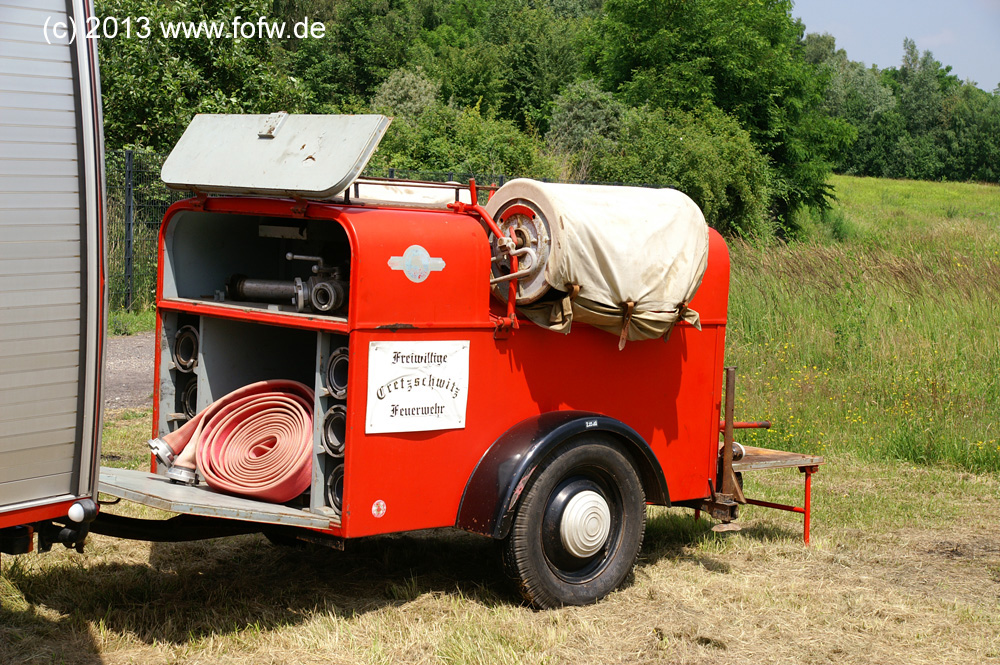 Sozusagen als "Verpackung" einer DDR TS8 kam im Mai 2013 ein alter Tragkraftspritzenanhänger aus DDR-Produktion zur FOFW. Dieser TSA aus dem Baujahr 1961 ist der indirekte Vorläufer des bereits bei der FOFW beheimateten Görlitzer TSA von 1982 auf dem HL 900-Fahrgestell: Während unseren Recherchen nach das 1961er Baujahr der Görlitzer TSA das letzte Baulos in Aufbau-Mischbauweise Holz/Stahl auf einfachem Zugbaum-Achse-Fahrgestell ist, welches auf Vorkriegskonstruktionen zurückzuführen ist, gab es ab 1962 noch eine um 35 kg leichtere Zwischenbaureihe, die das alte Fahrgestell mit dem von der jüngsten Görlitzer TSA bekannten Stahlblechaufbau mit doppelten Flügeltüren kombiniert. Nach den Typisierungsunterlagen folgte spätestens 1974 das doppelte Rohrrahmen-Fahrgestell HL 900 mit gleichem Aufbau.
